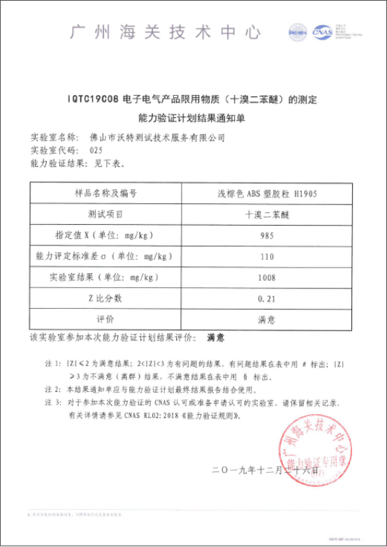 我司參加廣州海關技術中心組織的IQTC19C08電子電氣產(chǎn)品限用物質(十溴二苯醚)的測試能力驗證,并獲得滿意結果。