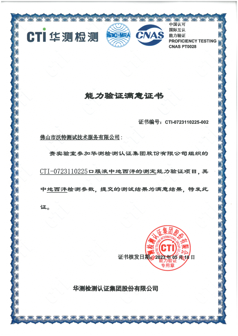 佛山沃特參加CTI-0723110225口服液中地西泮的測(cè)定獲“滿意”結(jié)果