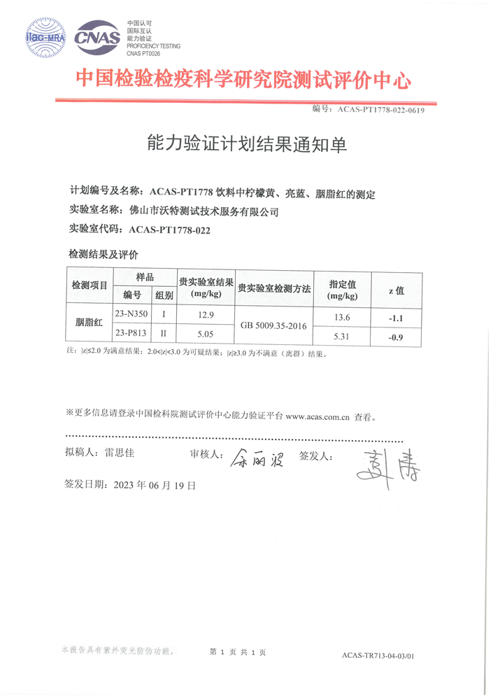 近日,佛山市沃特測(cè)試技術(shù)服務(wù)有限公司參加中國(guó)檢驗(yàn)檢疫科學(xué)研究院測(cè)試評(píng)價(jià)中心組織的ACAS-PT1778 飲料中檸黃、亮藍(lán)、胭脂紅的測(cè)定能力驗(yàn)證項(xiàng)目,其中胭脂紅檢測(cè)參數(shù),提交的測(cè)試結(jié)果為「滿意」結(jié)果。