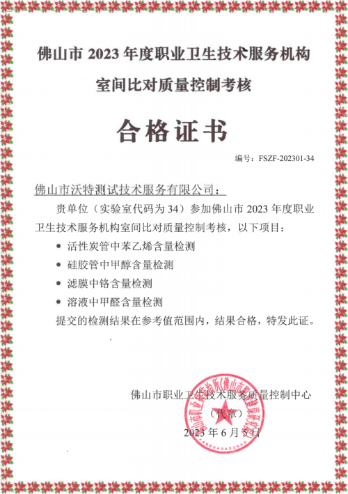 參加由佛山市職業(yè)衛(wèi)生技術(shù)服務(wù)質(zhì)量控制中心組織開展的2023年度職業(yè)衛(wèi)生技術(shù)服務(wù)機(jī)構(gòu)室間比對質(zhì)量控制考核,評定結(jié)果為「合格」。
