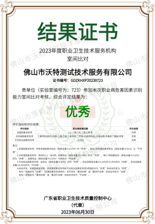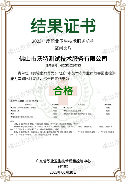 近日,佛山市沃特測試技術(shù)服務(wù)有限公司(以下簡稱“佛山沃特”)參加了廣東省及佛山市2023年度職業(yè)衛(wèi)生技術(shù)服務(wù)機(jī)構(gòu)室間比對,并順利通過了考核。其中: