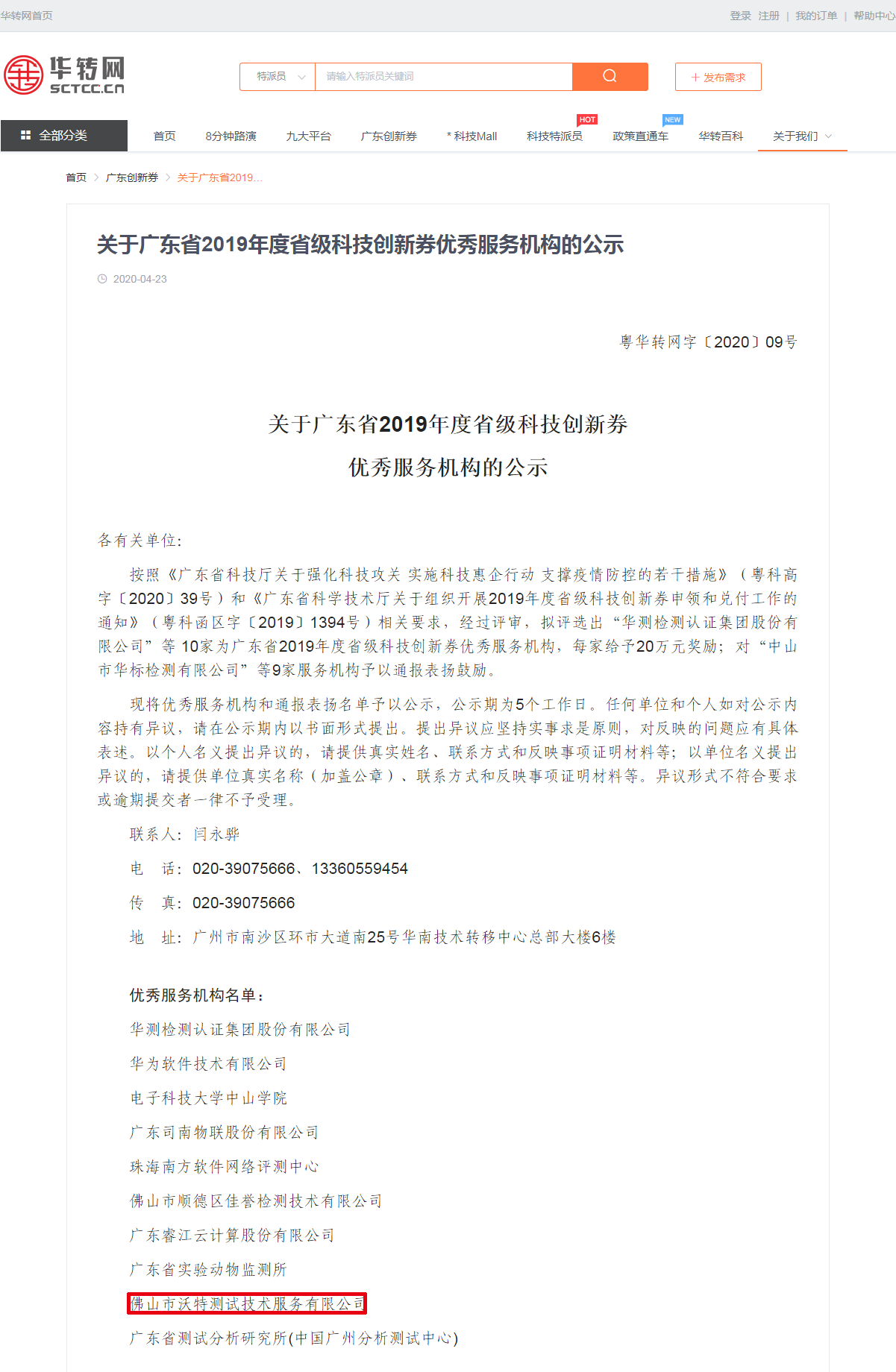 近日,佛山市沃特測(cè)試技術(shù)服務(wù)有限公司獲評(píng)“廣東省2019年度省級(jí)科技創(chuàng)新券優(yōu)秀服務(wù)機(jī)構(gòu)”,是華轉(zhuǎn)網(wǎng)按照廣東省科技廳的指示和要求,評(píng)選出的全省10家優(yōu)秀服務(wù)機(jī)構(gòu)之一。