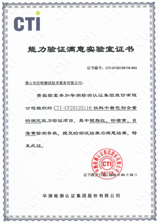 近日,沃特檢驗集團佛山分公司參加國家衛(wèi)生健康委職業(yè)安全衛(wèi)生研究中心組織的2020年度職業(yè)衛(wèi)生技術(shù)服務(wù)機構(gòu)實驗室檢測能力驗證和華測檢測認(rèn)證集團股份有限公司(CTI)組織的CTI-CF20125116飲料中著色劑含量的測定能力驗證等兩項能力驗證,均獲得了滿意結(jié)果。