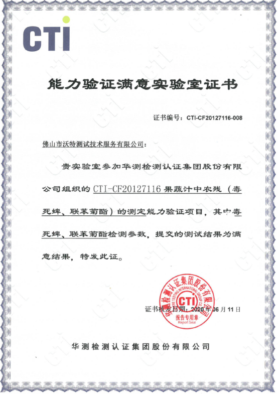 近日,沃特檢驗(yàn)集團(tuán)佛山分公司參加華測(cè)檢測(cè)認(rèn)證集團(tuán)股份有限公司(CTI)組織的CTI-CF20127116果蔬汁中農(nóng)殘(毒死蜱、聯(lián)苯菊酯)的測(cè)定能力驗(yàn)證和佛山市職業(yè)衛(wèi)生技術(shù)服務(wù)質(zhì)量控制中心組織的2020年度職業(yè)衛(wèi)生檢測(cè)實(shí)驗(yàn)室室間質(zhì)量控制比對(duì)考核等兩項(xiàng)能力驗(yàn)證,均獲得了滿意結(jié)果。