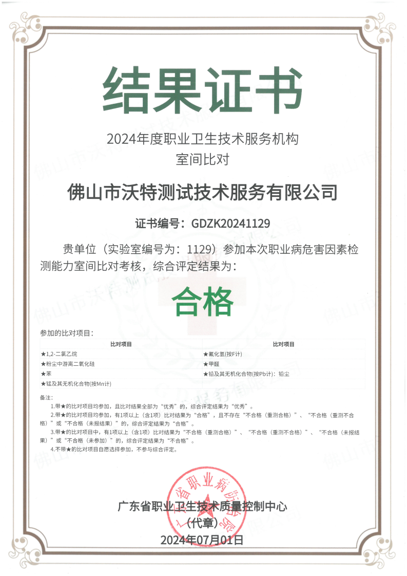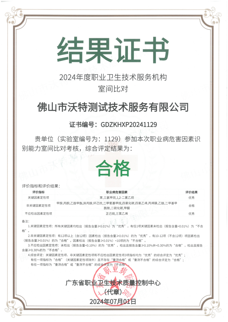 近日,佛山市沃特測試技術(shù)服務有限公司(以下簡稱“佛山沃特”)參加了廣東省職業(yè)衛(wèi)生技術(shù)質(zhì)量控制中心組織開展的2024年度職業(yè)衛(wèi)生技術(shù)服務機構(gòu)室間比對(職業(yè)病危害因素識別能力、檢測能力)考核,綜合評定結(jié)果均為“合格”。