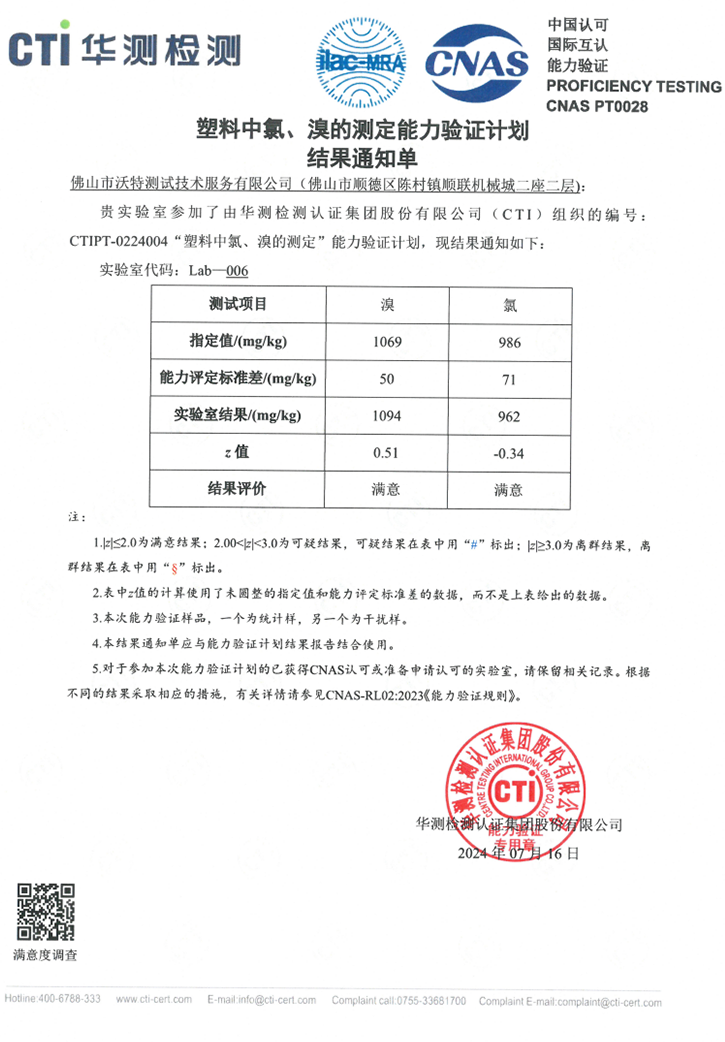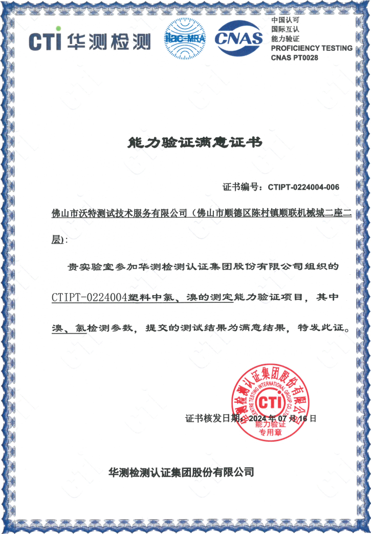 佛山沃特參加CTIPT-0224004塑料中氯、溴的測定能力驗證 獲“滿意”結(jié)果