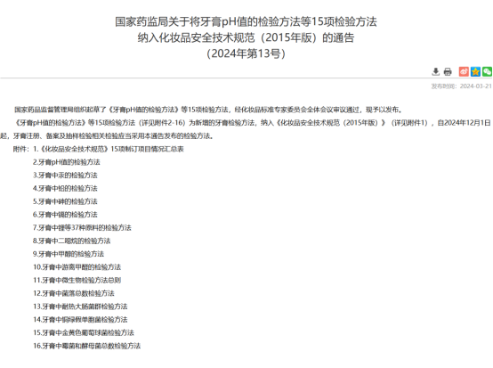 2024年3月21日,國家藥監(jiān)局發(fā)布了《牙育pH值的檢驗(yàn)方法》等15項(xiàng)檢驗(yàn)方法,作為新增的牙育檢驗(yàn)方法,納入《化妝品安全技術(shù)規(guī)范(2015年版)》。自2024年12月1日起,牙膏的注冊(cè)、備案及抽樣等應(yīng)采用新的檢驗(yàn)方法。