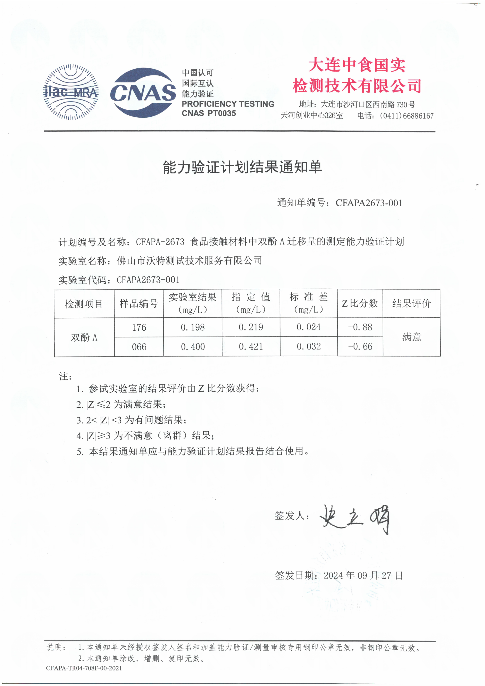 佛山沃特參加CFAPA-2673食品接觸材料中雙酚A遷移量的測定能力驗證 獲“滿意”結果