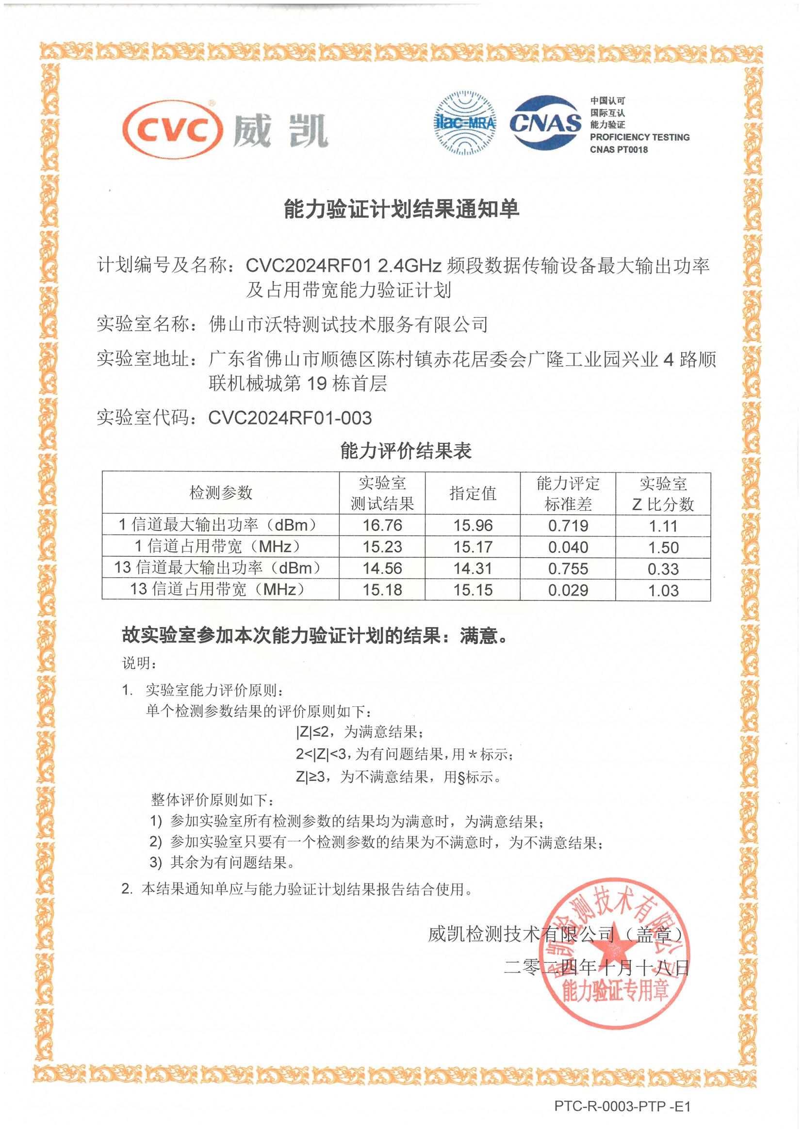 近日,佛山市沃特測試技術(shù)服務(wù)有限公司參加威凱檢測技術(shù)有限公司組織的CVC2024RF01 2.4GHz頻段數(shù)據(jù)傳輸設(shè)備最大輸出功率及占用帶寬能力驗證計劃,評價結(jié)果為滿意。