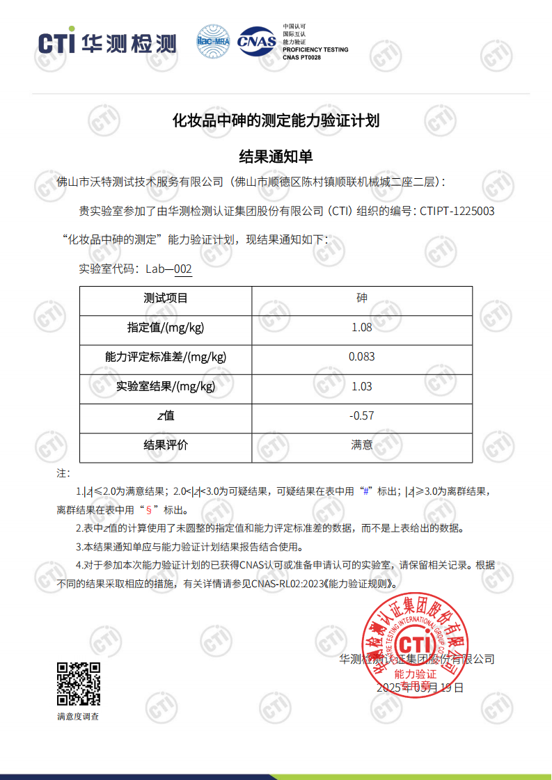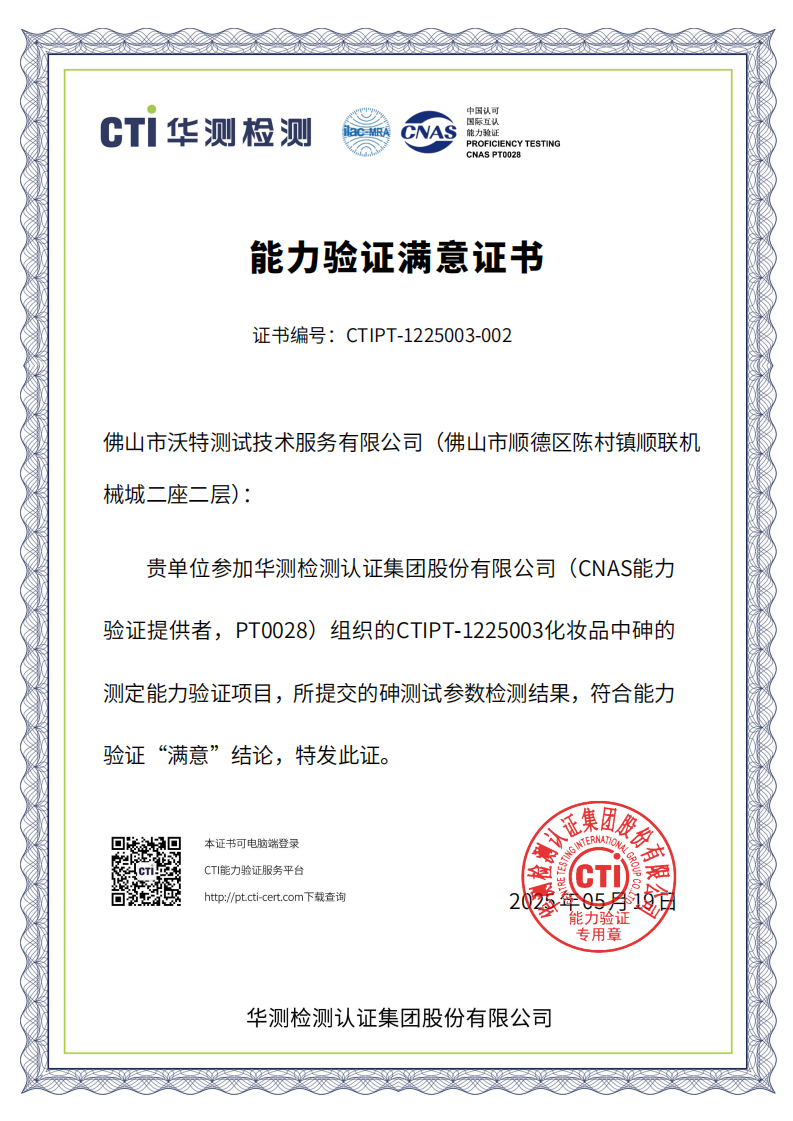 佛山沃特參加CTIPT-1225003化妝品中砷的測(cè)定能力驗(yàn)證 獲“滿意”結(jié)果