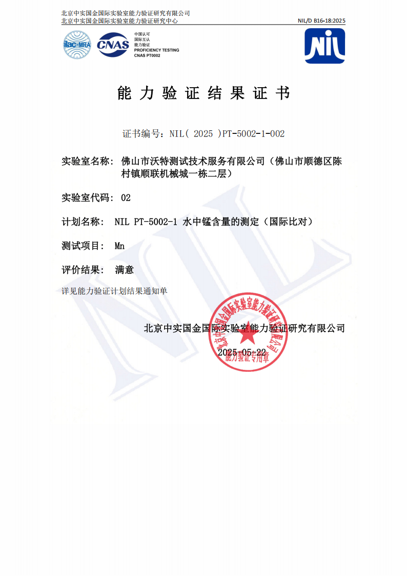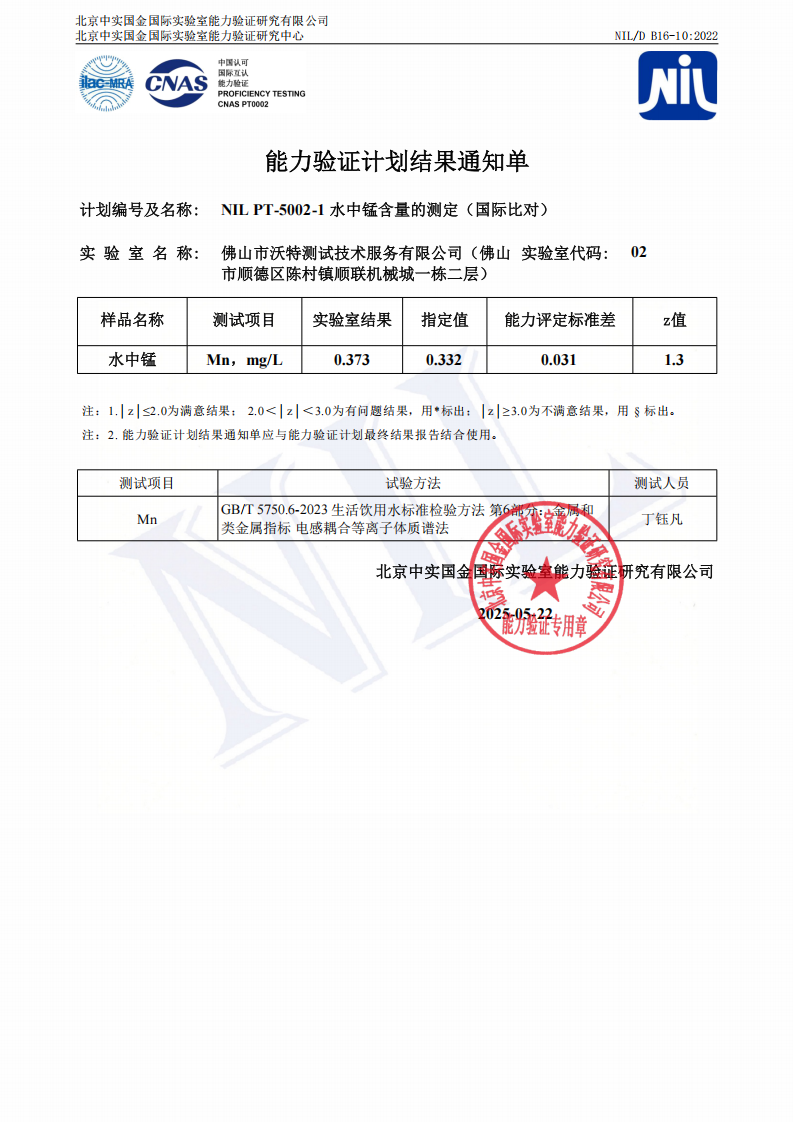 近日,佛山市沃特測試技術(shù)服務(wù)有限公司(以下簡稱“佛山沃特”)參加北京中實國金國際實驗室能力驗證研究有限公司組織的NIL PT-5002-1 水中錳含量的測定(國際比對)能力驗證計劃,其中錳測試項目評價結(jié)果為滿意。