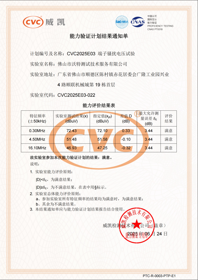 佛山沃特參加CVC2025E03端子騷擾電壓試驗能力驗證 獲“滿意”結(jié)果