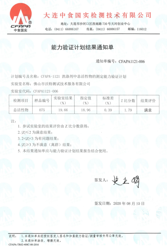 佛山沃特參加CFAPA-1121 洗滌劑中總活性物的測定能力驗(yàn)證獲得滿意結(jié)果