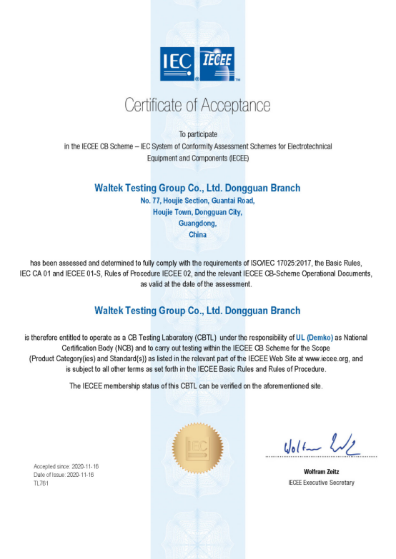 近日,深圳沃特檢驗集團有限公司東莞分公司(以下簡稱“沃特東莞”)獲得由IECEE頒發(fā)的CB Testing Laboratory(以下簡稱“CBTL”)授權(quán)證書。