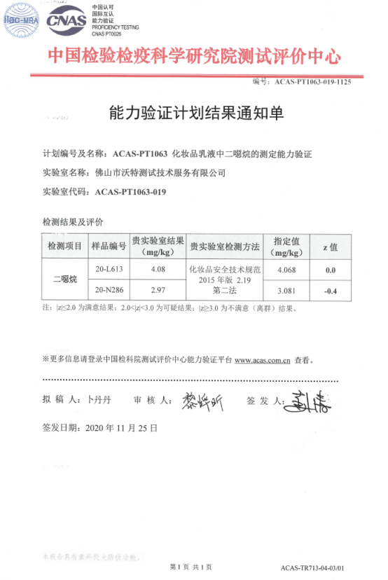 佛山沃特參加中國檢科院測試評價中心ACAS-PT1063 化妝品乳液中二噁烷的測定能力驗證獲得滿意