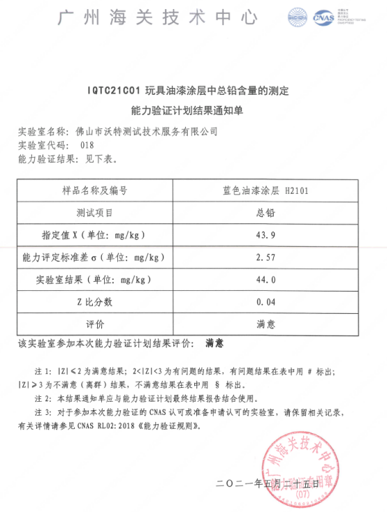 近日,沃特檢驗集團佛山分公司參加廣州海關(guān)技術(shù)中心IQTC21C01 玩具油漆涂層中總鉛含量的測定能力驗證,并獲得滿意結(jié)果。